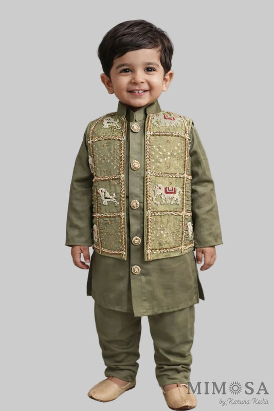Linen satin kurta set with intricately embroidered jacket