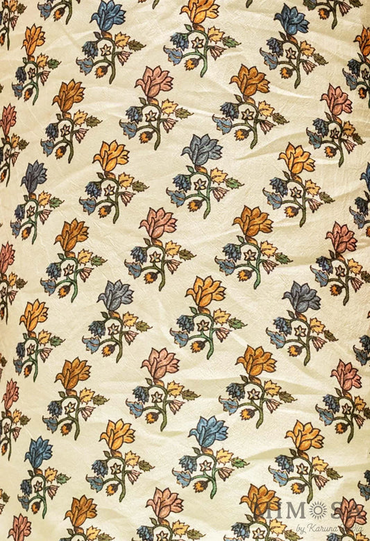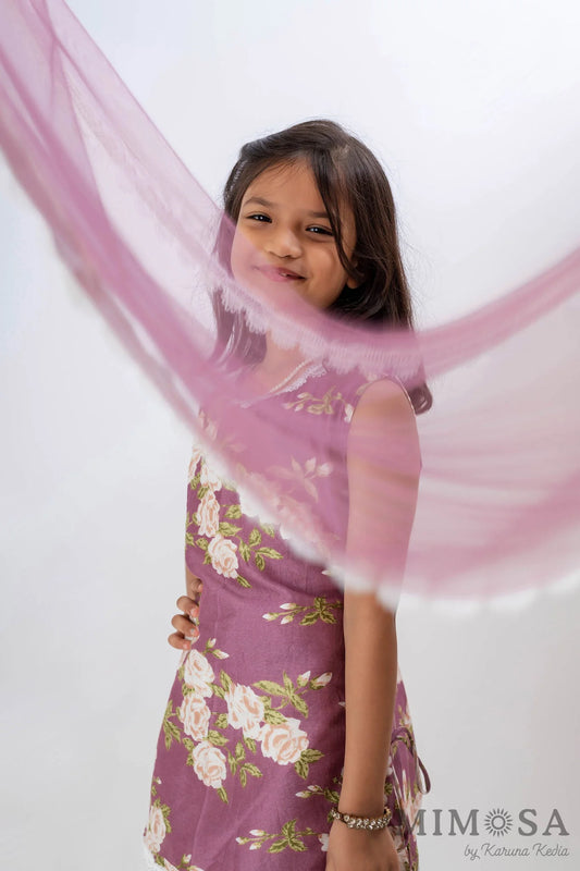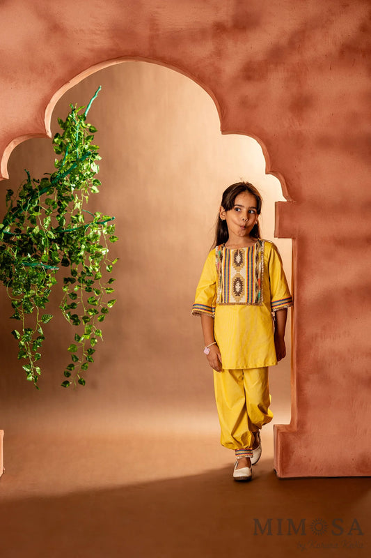 Chanderi printed Kurta pajama with gota embroidered yoke paired with cotton silk bottom