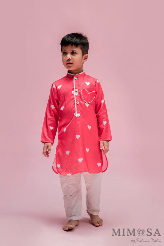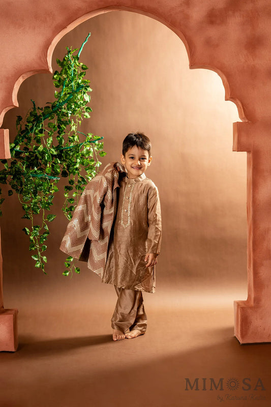 Boys kurta set with printed and embroidered patterned yoke in Bambar silk