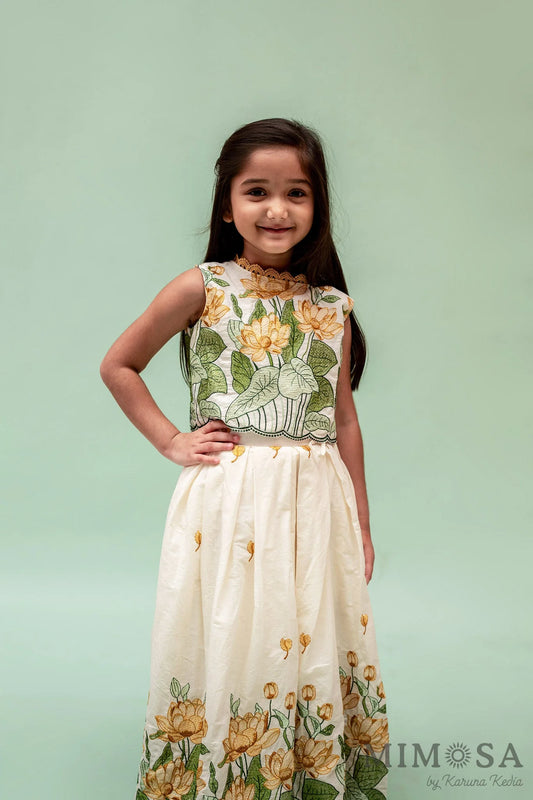 Green floral printed skirt with scalloped embroidered top