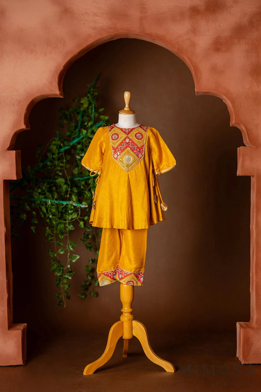 Embroidered yoke, tassel enhanced mustard kurti and pants