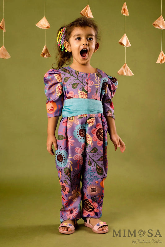 Floral jumpsuit with a tieup belt and front zip