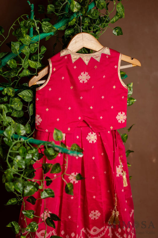 Fuschia jamdani skirt top set with bow detailed back