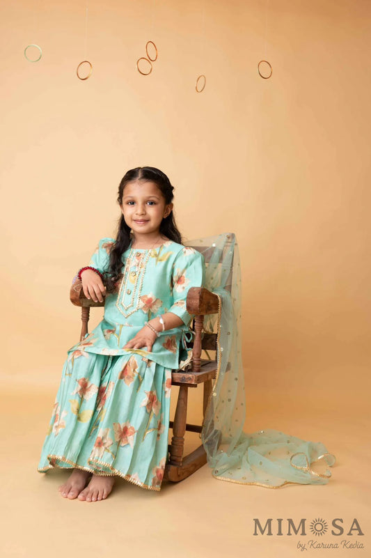 Sage green Kurta pajama in Bambar silk with print and embroidered yoke