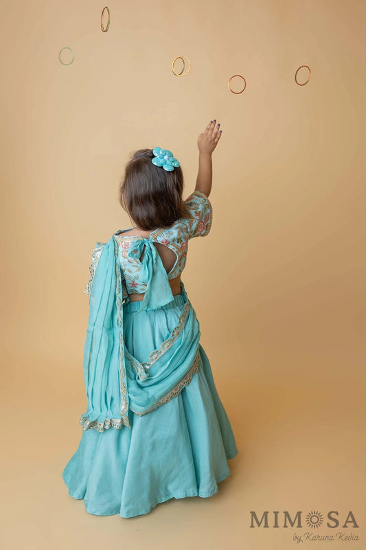 Teal lehenga with embroidered blouse and draped dupatta pallu