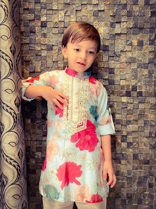 Vibrant floral print lined Kurta with Mirror Work borders comes with bottoms also has roll up sleeves
