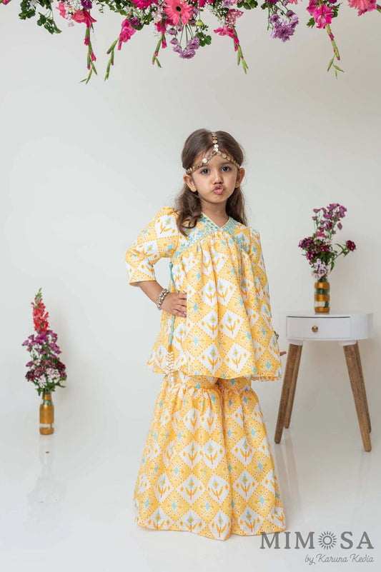 Yellow Ikat sharara set with mirror work detailing