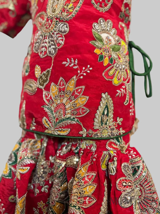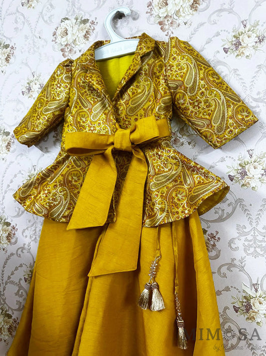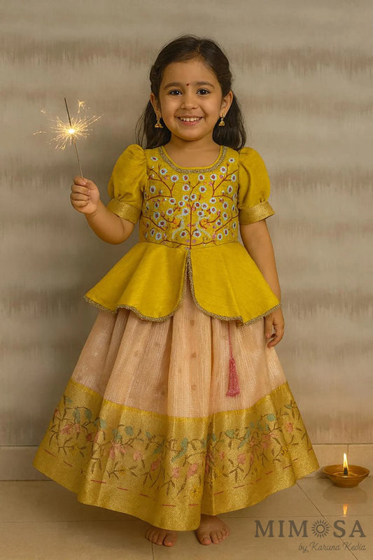Zari Kota tissue Lehnga with Bambar silk peplum top with handwork and lined with cotton silk