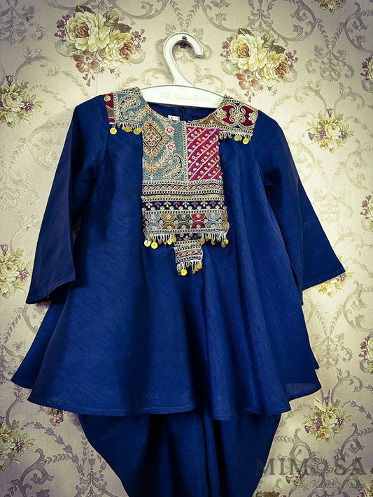 Frockstyle kurti with embroidered and embellished yoke paired with dhoti