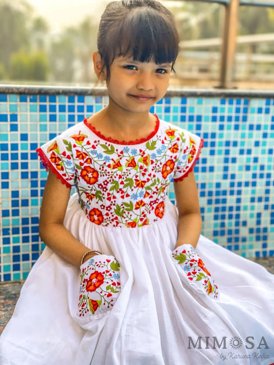 White cotton dress with Mexican floral embroidery comes with pockets
