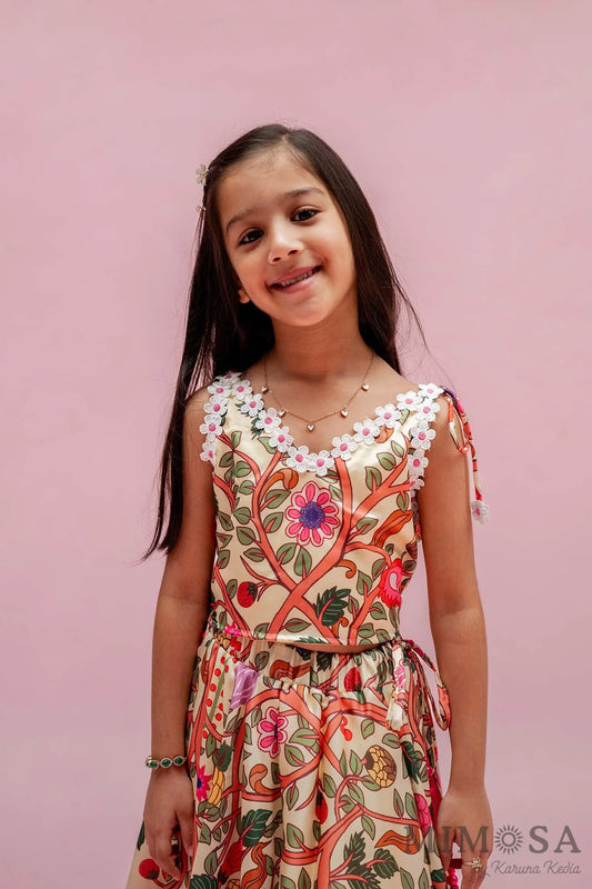 Multicolor Kalamkari prints skirt and top in vibrant hues