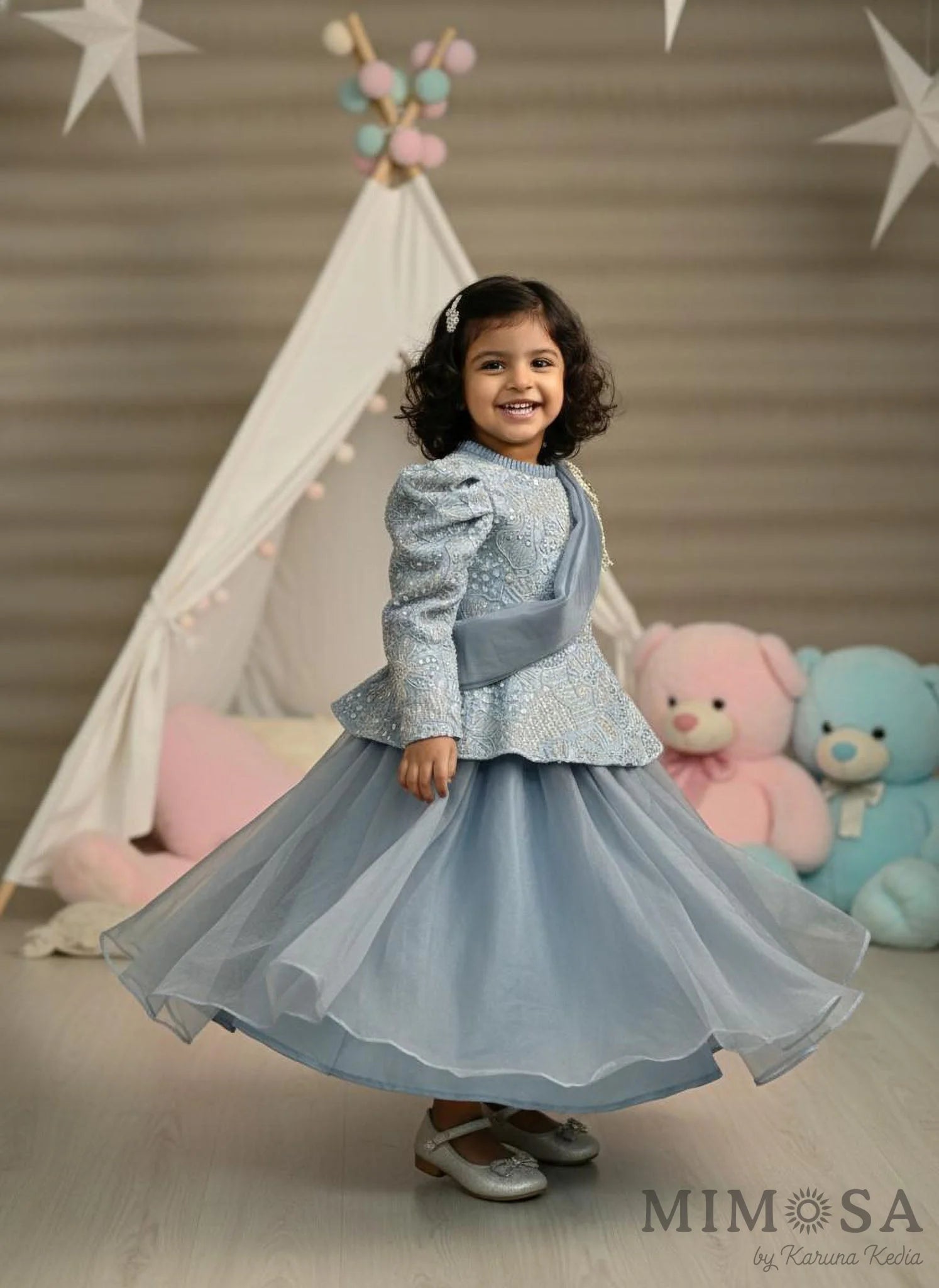 A beautifully embroidered peplum top paired with a flowy organza skirt and a draped sash, finished with a statement brooch. Light, graceful, and festive—this ensemble is perfect for weddings, celebrations, and special occasions.