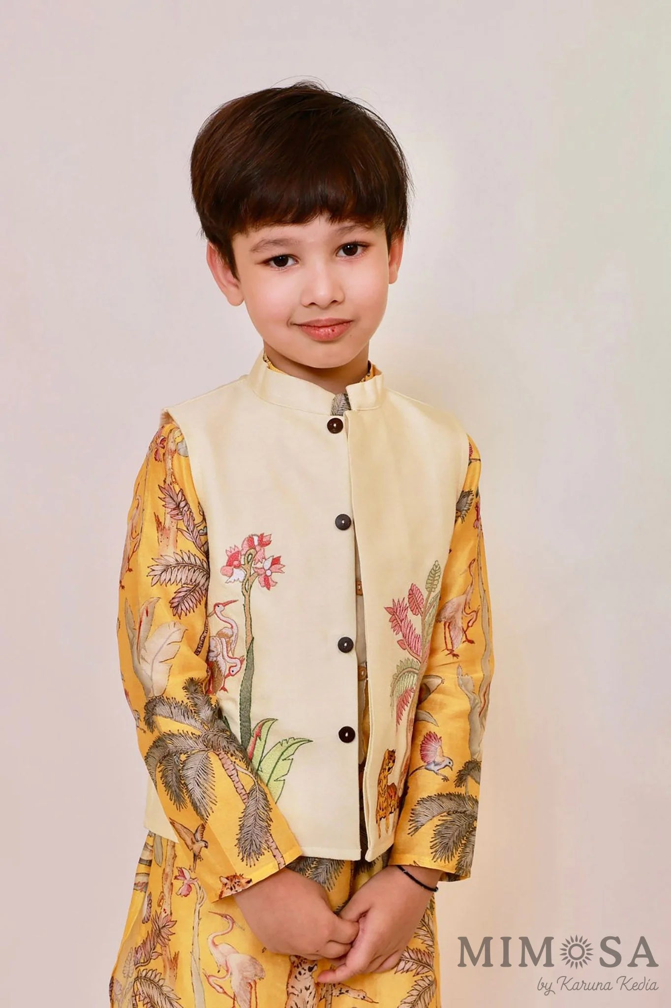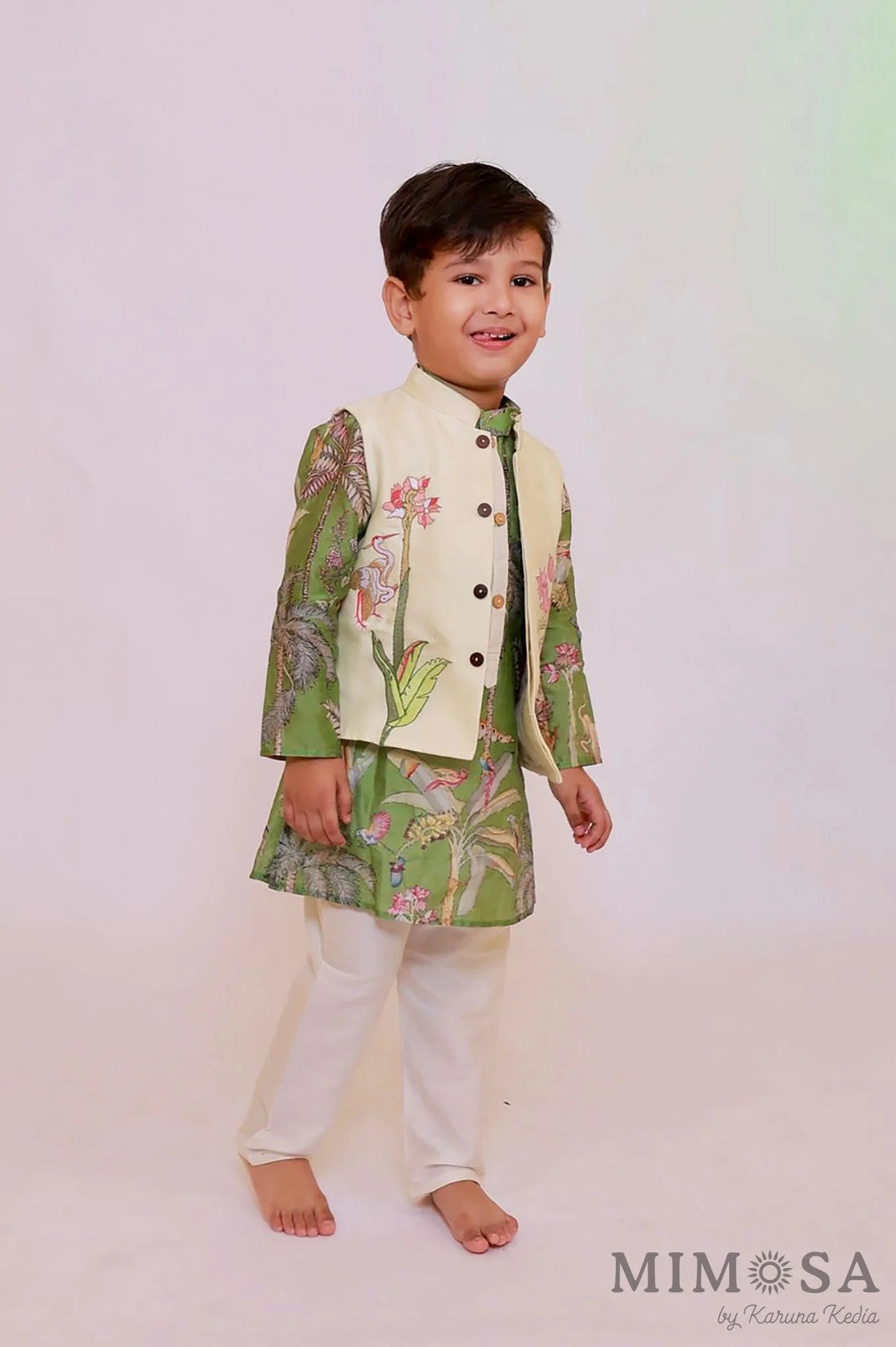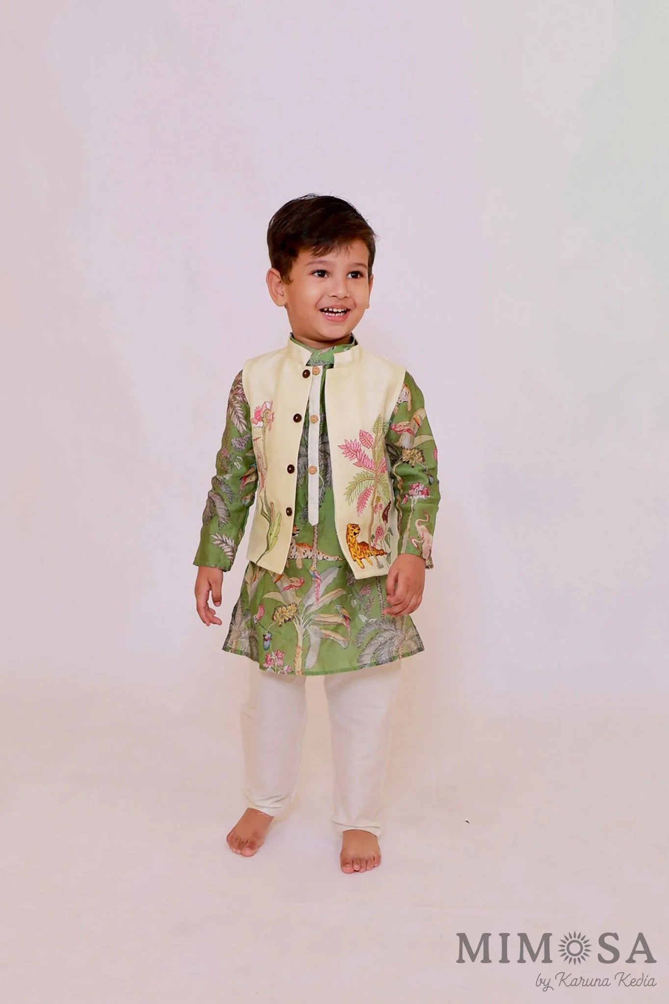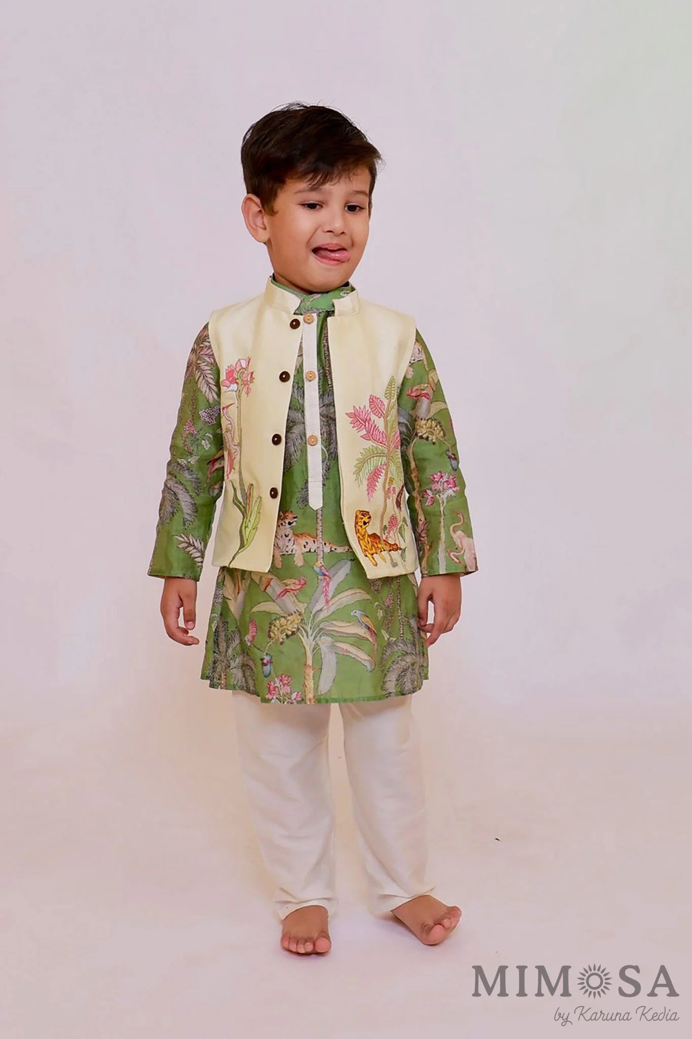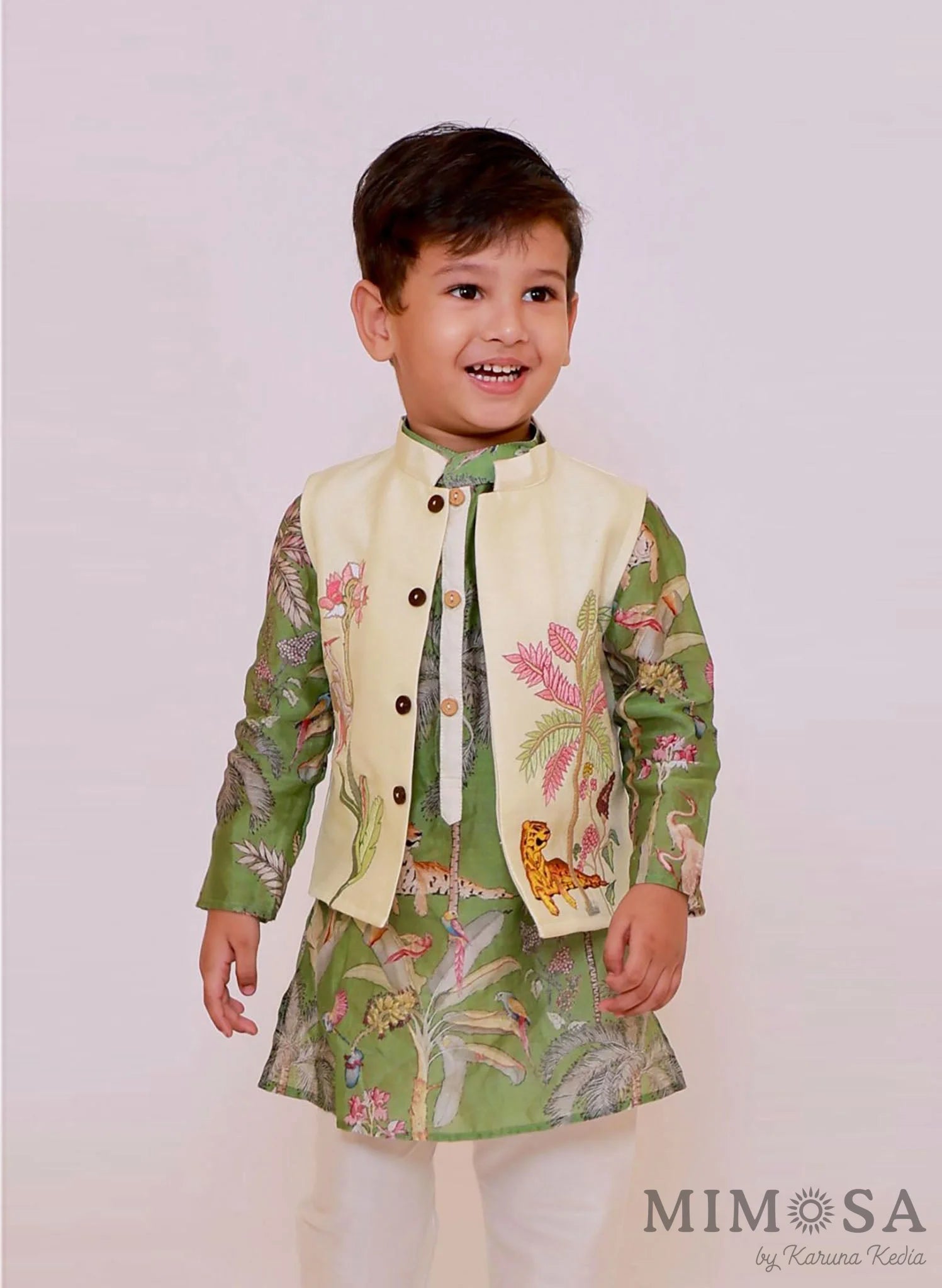 Jungle print with tiger pure Chanderi kurta with contrast placket paired with embroidered jacket and cotton silk bottom