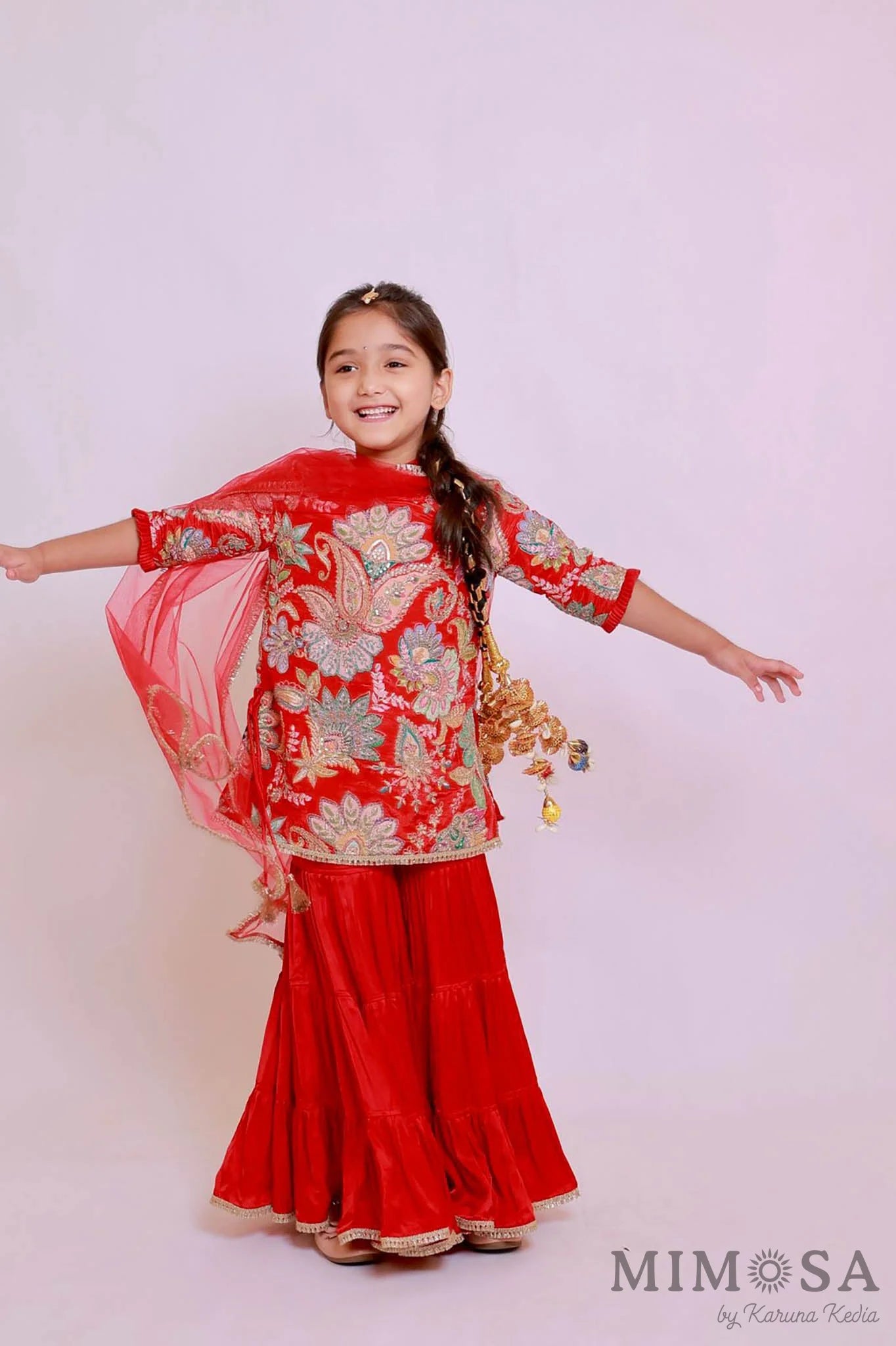 Paisley traditional print on crepe with embroidery allover paired modal satin sharara and net stole