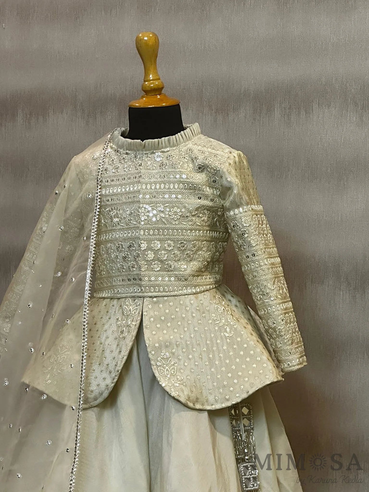Tissue brocade, peplum blouse with Bamber silk skirt with tassels and organza Dupatta with allover buta
